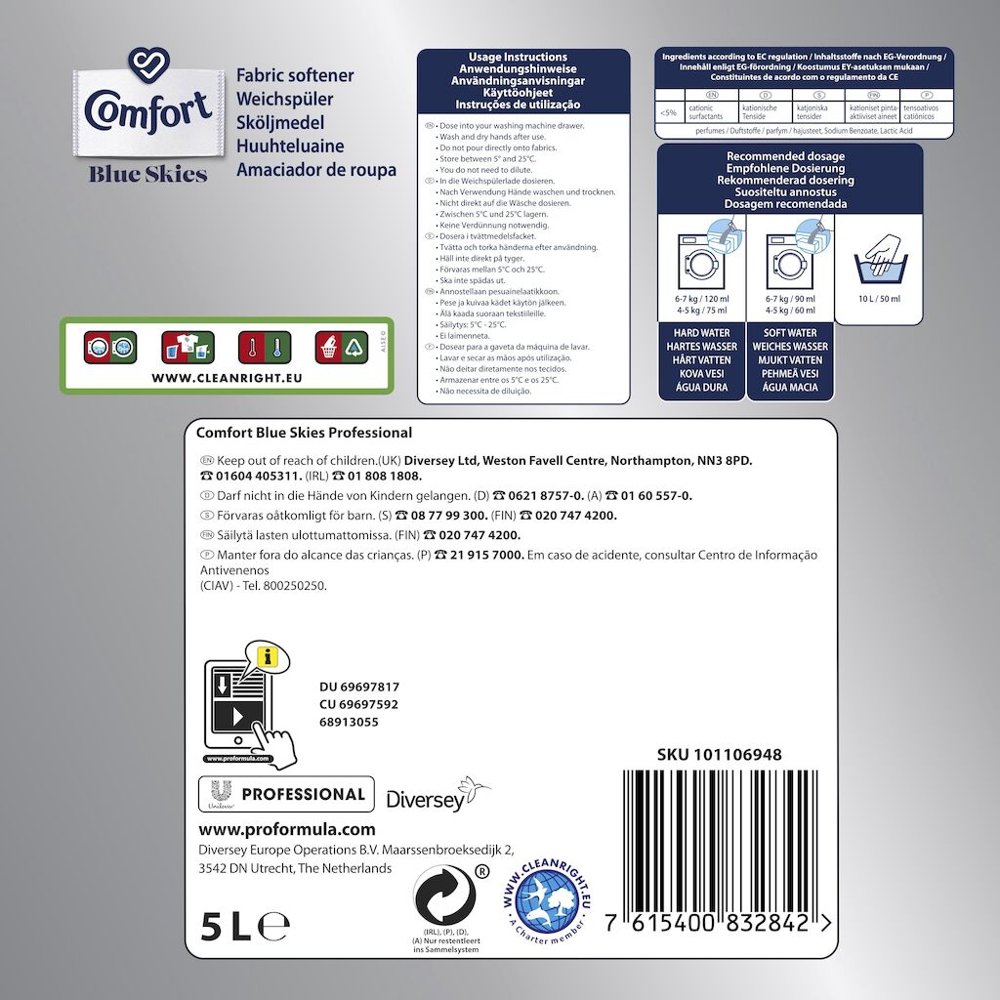 Comfort Blue Skies ger inte bara exceptionell mjukhet och fantastiska dofter: om du använder den i varje tvätt blir kläderna mjuka och skonsamma mot huden, kläderna kan andas och färgerna skyddas. Den bidrar också till att kläderna ser nyare ut längre, och efter tvätten förkortar den torktiden och underlättar strykningen.