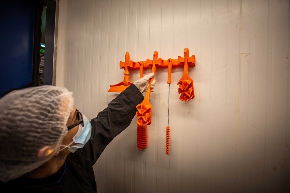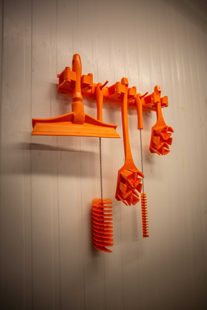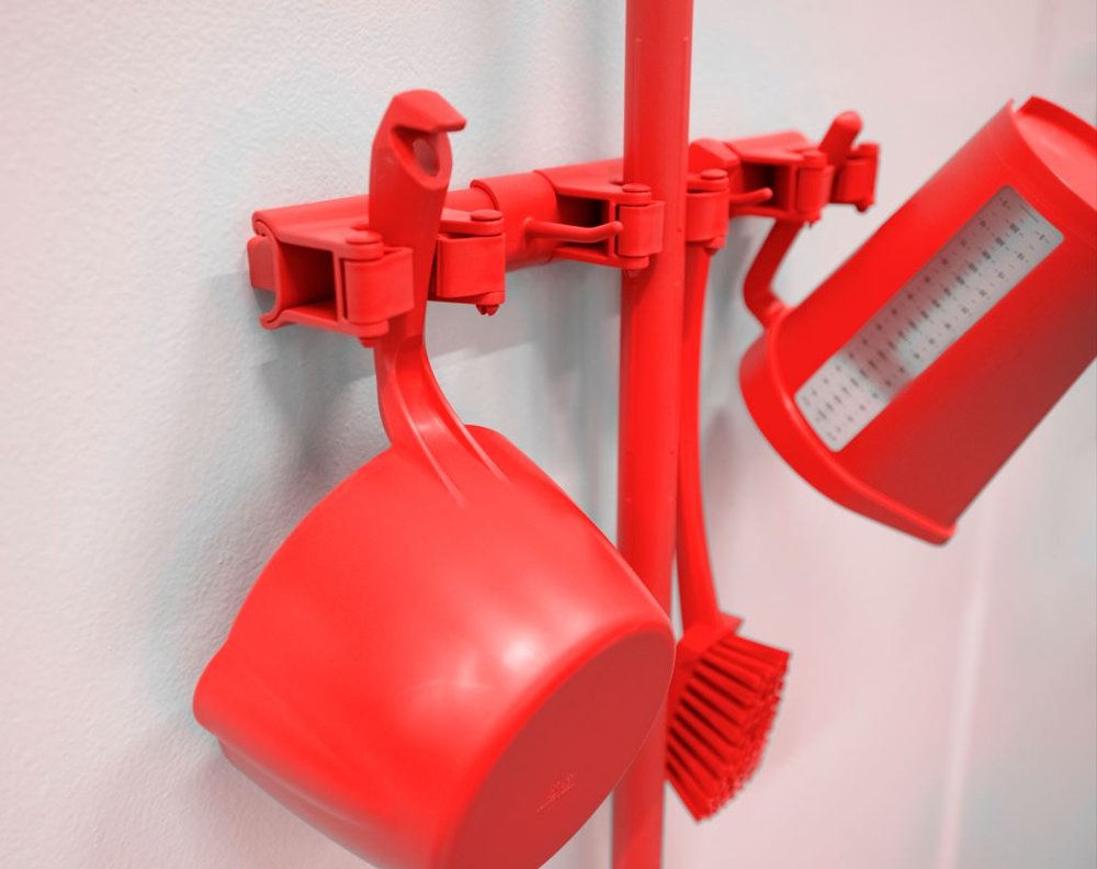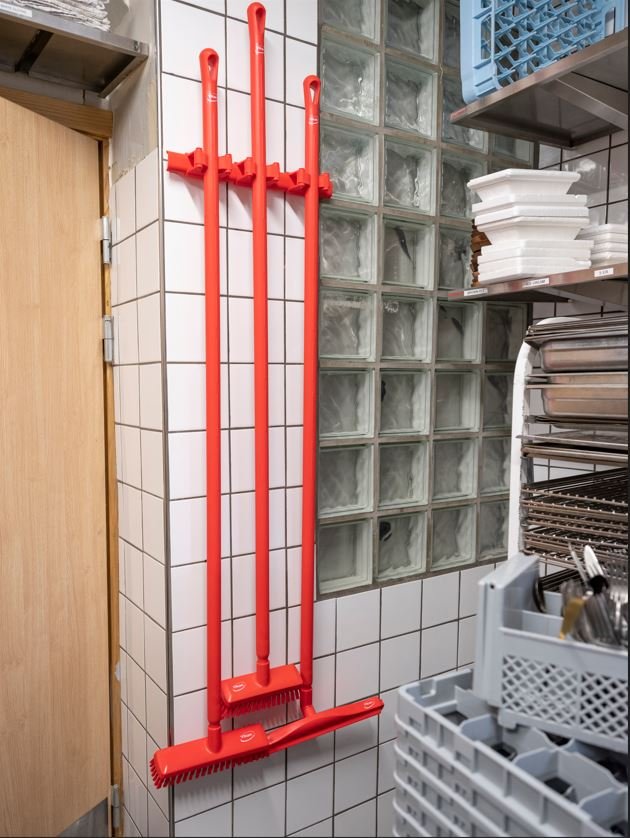 Hygieniskt väggupphäng med en flexibel lösning för förvaring av redskap i alla områden. Upphänget är baserat på moduler. Skenan fästs enkelt på de fyra väggfästena genom att skjutas på från sidan. Gummibandshållare och krokar klickas därefter fast på skenan, små klackar i konstruktionen säkerställer att de inte kan glida i sidled. Skenans kapacitet är 1-10 moduler, max 5 gummibandshållare/ 10 krokar. Gummibandshållarna håller redskap med en diameter på 28-33 mm. Krokarna klarar en vikt på upp till 3 kg. Hållaren levereras med 3 gummibandshållare och 2 krokar. Modulerna är lätta att demontera/ montera vid rengöring och byte.
