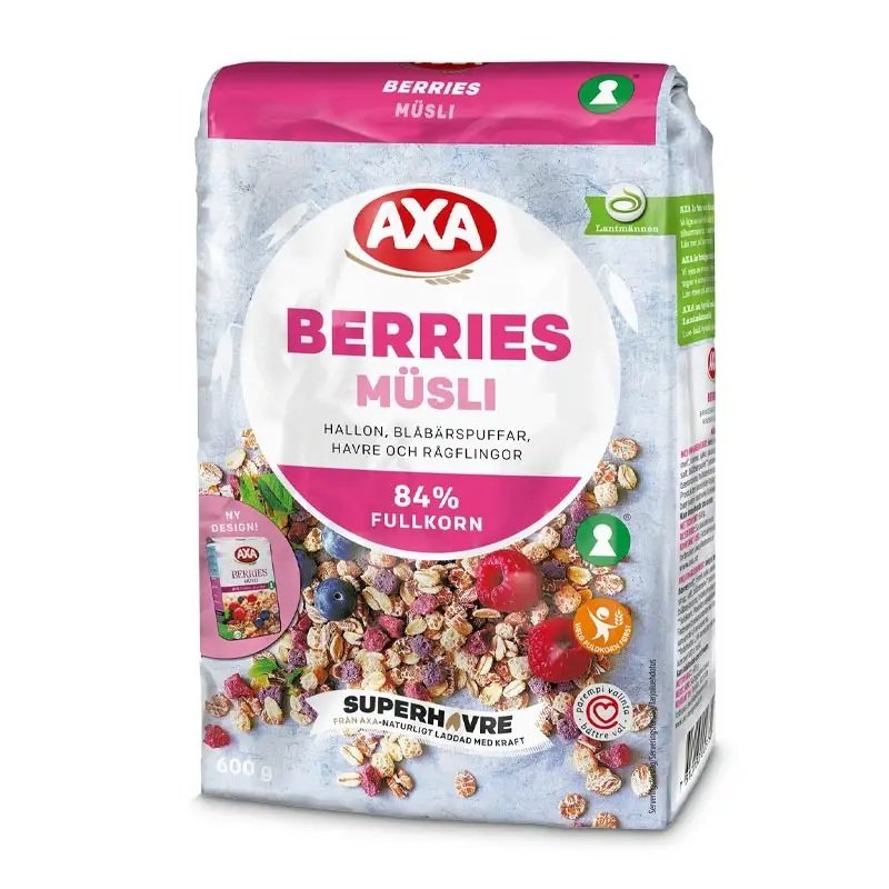 Müsli Berries från Axa för caféer, återförsäljare och restauranger. Müsli med smak av blåbär och hallon. Gjord på krispiga blåbärs- och hallonpuffar samt smakrik havre berikad med vitaminer och mineraler som zink och järn. Innerhåller hela 84% fullkorn och erhåller nyckelhålsmärkning. Nyckelhålet - Nyttigare val i sin livsmedelsgrupp.