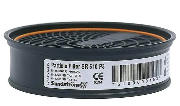 Partikelfilter SR 510 P3 R, för användning i fläkt SR 500 alternativt i Sundströms halv- eller helmasker. Helt nyutvecklat, med stor filteryta och mycket lågt tryckfall. Framtaget för att klara de höga luftflöden som fläkten ger. Skyddar mot alla slags partiklar, både fasta och vätskeformade. Med en avskiljningsgrad på 99,997% är det ett av marknadens mest effektiva partikelfilter. Används separat eller tillsammans med gasfilter.