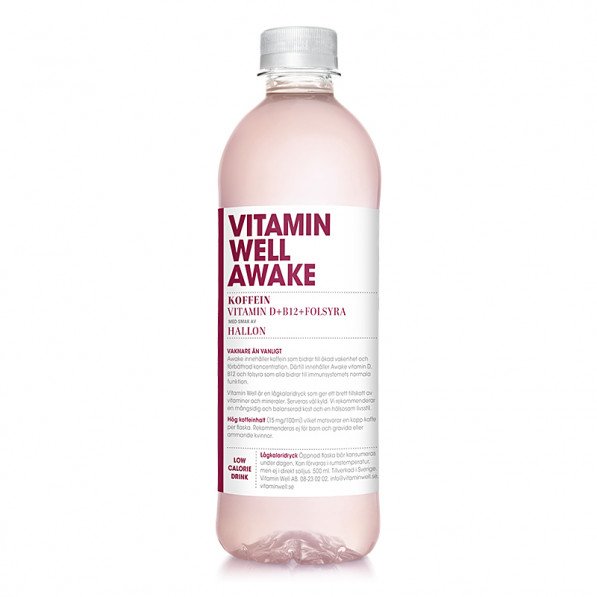 Vitamin Well Upgrade med smak av hallon. Vitamin Well-serien består av 8 olika drycker, alla med en egen smak och med en unik funktion och uppsättning vitaminer och mineraler. Denna dryck är först och främst otroligt god, men den gör dig också som namnet avslöjar mer vaken. En flaska innehåller 67,5 mg koffein vilket också förbättrar din koncentration. Förutom koffein innehåller Awake betydande mängder av vitamin D, B12 och folsyra som alla hjälper immunsystemet och dess funktion.