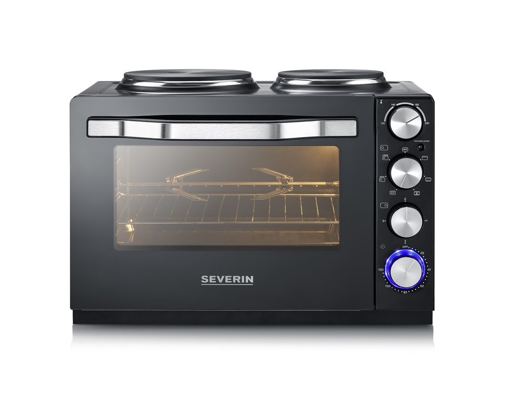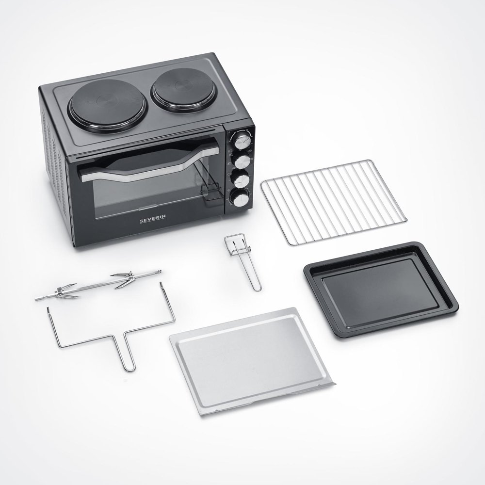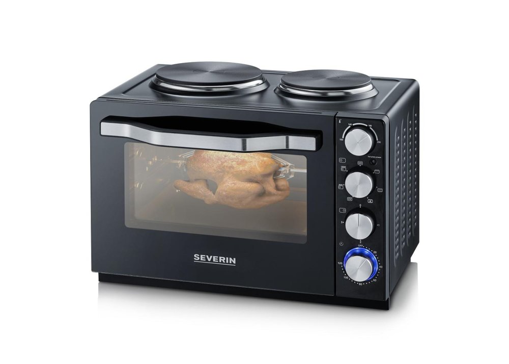 Bänkspis i snygg svart design. Plugga i kontakten och du har en fungerande matlagningsplats. Två kokplattor i gjutjärn och en ugn på 30 liter. Fungerar alldeles utmärkt i alla typer av boende. Godkänd efter de senaste EU-kraven. Ugnen har varmluftsfunktion för effektiv och bra matlagning. Skulle du vilja ha en fin grillad kyckling så finns det roterande grillspett som gör kycklingen gyllenbrun och knaprig.