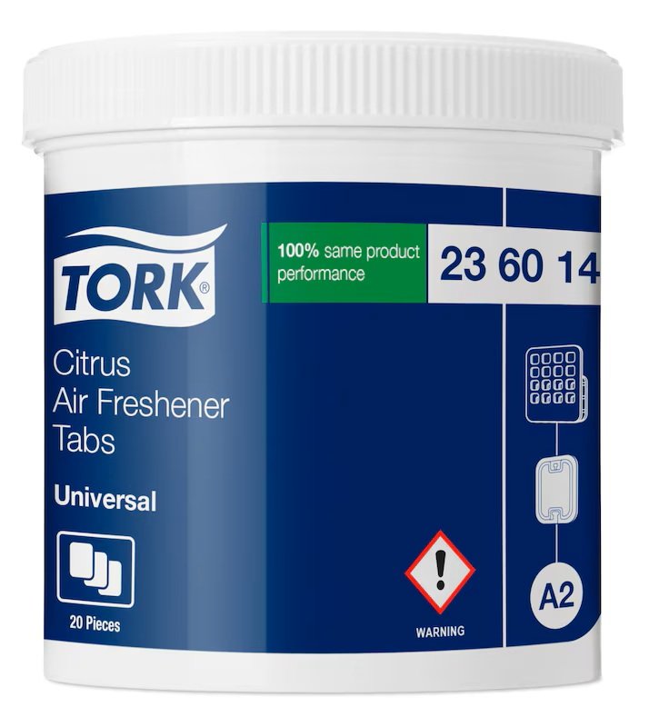 Ge toalettutrymmet en fräsch doft med Tork Airfreshener Doftplattor. Den impregnerade gummiplattan kan placeras på alla platser där den behövs och avger en fräsch doft av citron.