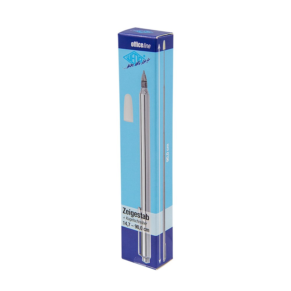 Teleskopisk pekpenna som kan förlängas till 90 cm. Med klämma och standardkulspets. Levereras på blisterkort. Mått: längd: 14,7 cm