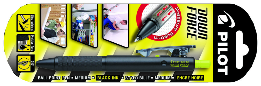 Down Force är en kulspetspenna för tuffa miljöer! Den skriver på de flesta underlag även under fuktiga förhållanden. Pennan går att skriva i 360 grader och består av slagtålig plast. Clipsen går att använda 100 000 gånger och pennan har ett hål för att hängas i kedjor och hål.