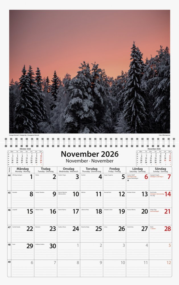 Spiralbunden väggkalender med hängare. En månad per blad med plats för anteckningar. Bilder på Svensk natur på varje uppslag. Svenska, Engelska, Tyska