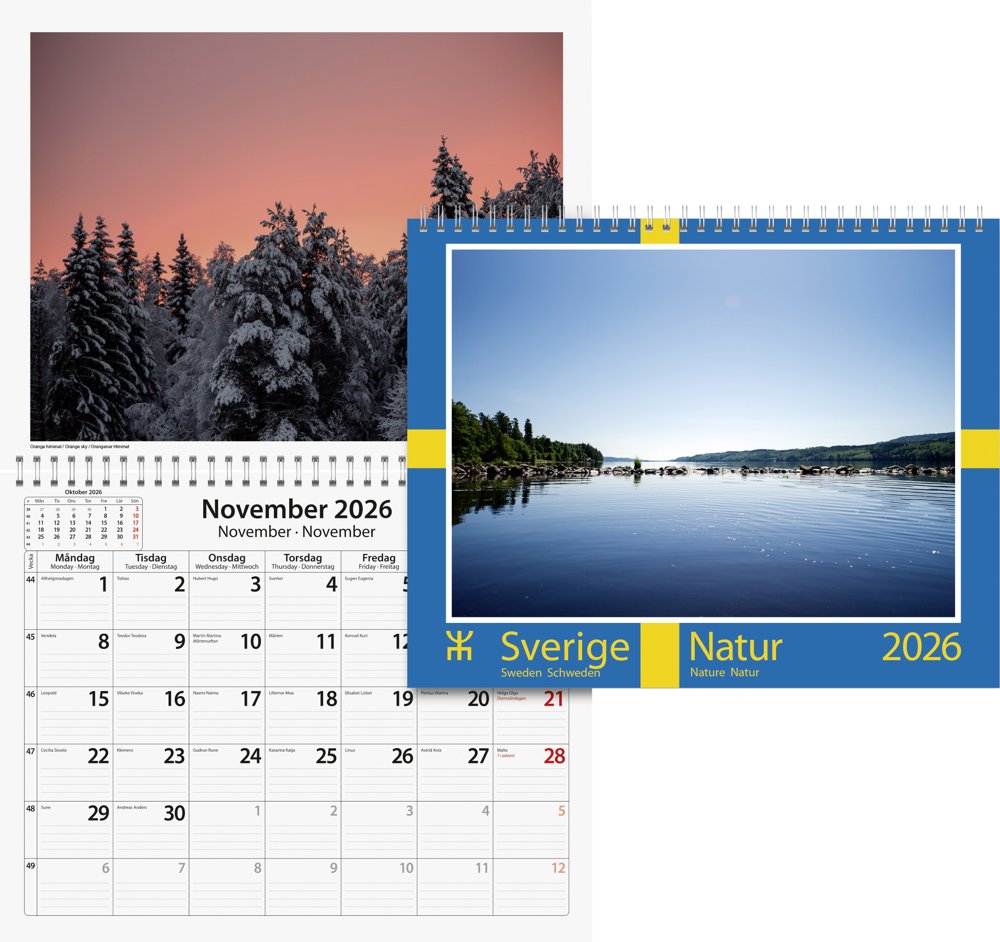 Sverige Natur 30 x 24 cm · 12 månadsblad med bild på varje uppslag · Wire-O med hängare · 1 månad/blad · 3 språk: Svenska, Engelska och Tyska, Förpackad i stadigt kuvert