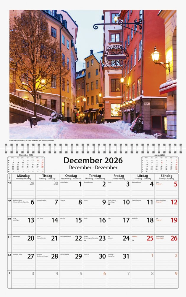Spiralbunden väggkalender med hängare. En månad per blad med plats för anteckningar. Bilder på sevärdheter i Sverige på varje uppslag. Svenska, Engelska, Tyska
