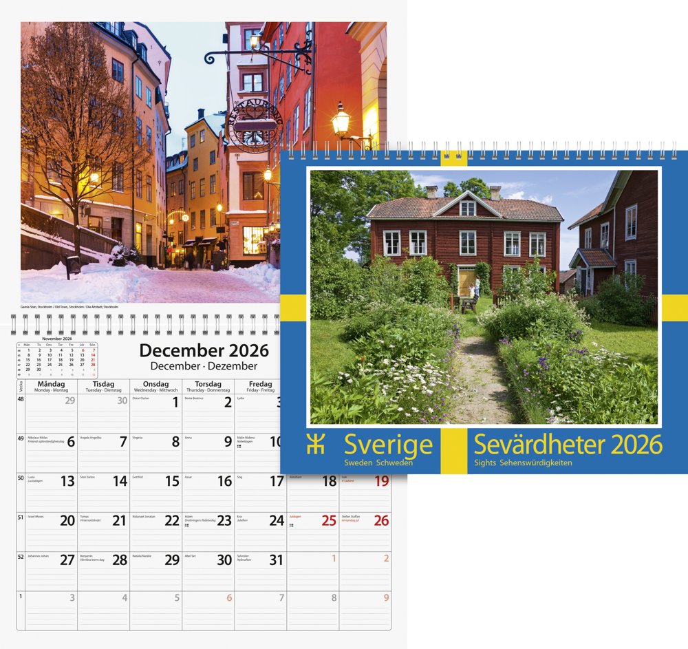 Sverige Sevärdheter 30 x 24 cm · 12 månadsblad med bild på varje uppslag · Wire-O med hängare · 1 månad/blad · 3 språk: Svenska, Engelska och Tyska, Förpackad i stadigt kuvert