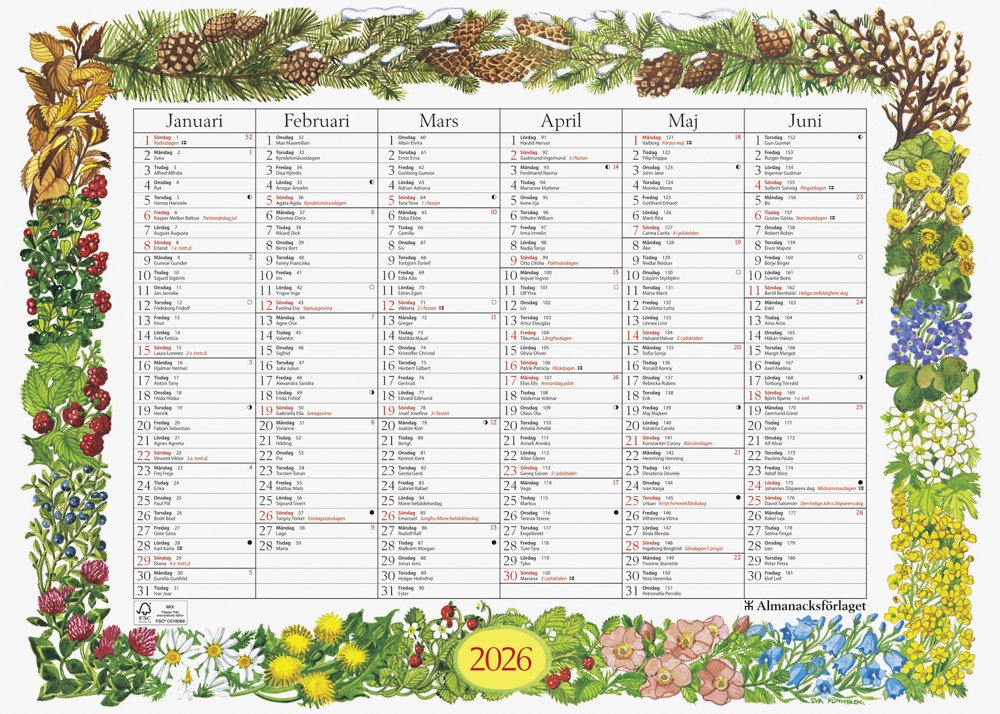 Stor Årstid 49 x 35 cm · Med namnsdagar, Plats för anteckningar · Kraftig kartong · 6 månader/sida · Kalendariet pryds runt om av akvarell med motiv ur växtfloran för de olika årstiderna, Konstnär Eva Rönnblom