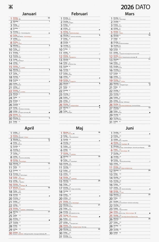 Datumkalender i kraftig kartong med sex månader per sida. Innehåller namnsdagar och plats för anteckningar.