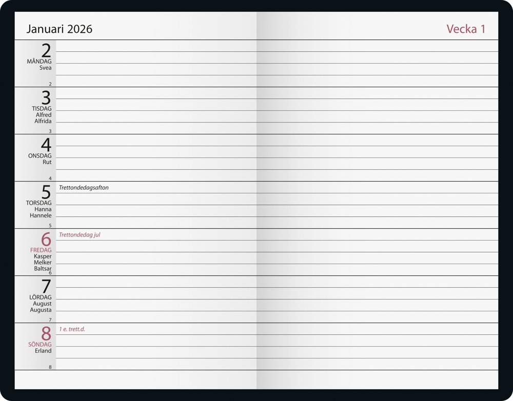 Praktisk kalender i fickformat med en vecka per uppslag och mycket plats för anteckningar, innehåller också en informativ textdel. Årsplaner för innevarande år samt nästa år. Kalendariska uppgifter, solens upp- och nedgång samt allmänna helgdagar. Pärm i svart konstläder.