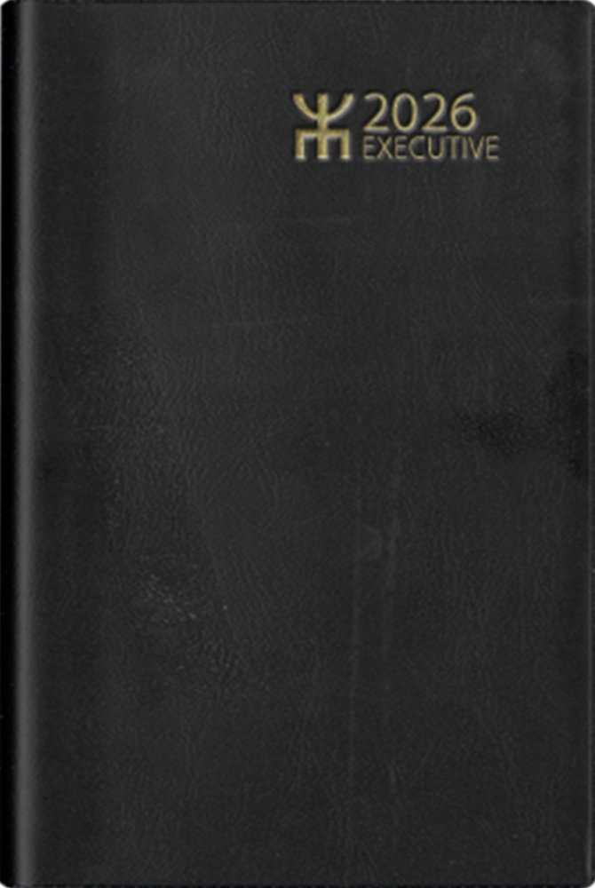 Executive · 8,2 x 12,8 cm · 184 sidor · Plast · Svart · Inbunden · 1 vecka/uppslag · Årsplaner 2026/2027 · Kalendariska uppgifter, Allmänna helgdagar, Månadsöversikt på varje uppslag, Solens upp- och nedgång, Anteckningssidor