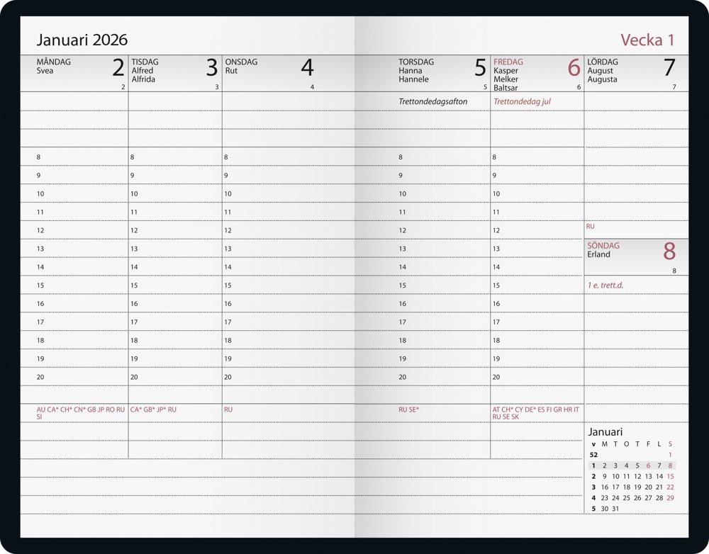 Praktisk inbunden kalender i fickformat med en vecka per uppslag och månadsöversikt på varje uppslag. Årsplaner för innevarande år samt nästa år, kalendariska uppgifter, solens upp- och nedgång, allmänna helgdagar, anteckningssidor. Innehåller världsatlas, veckoöversikt och liten telefonbok. Pärm i svart plast.