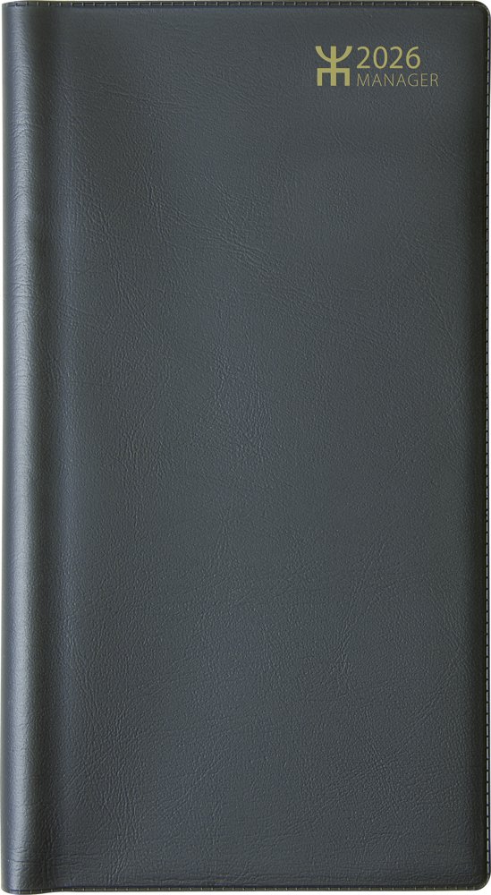 Manager · 8,7 x 15,3 cm · 172 sidor · Plast · Svart · Wire-O · 1 vecka/uppslag · Vecka 44/2025 - Vecka 18/2027 · Årsplan 2027 · Utbytbart kalendarium, Allmänna helgdagar, Månadsöversikt på varje uppslag, Solens upp- och nedgång, Anteckningssidor