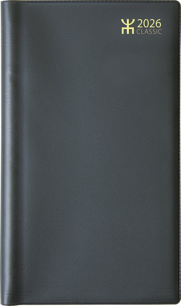 Classic · 8,7 x 15,3 cm · 140 sidor · Plast · Svart · Wire-O · 1 vecka/uppslag · Årsplaner 2026/2027 · Utbytbart kalendarium, Kalendariska uppgifter, Nationella helgdagar, Månadsöversikt på varje uppslag, Solens upp- och nedgång, Anteckningssidor