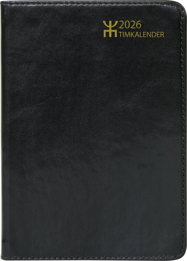 Timkalender · 10,5 x 15 cm · 424 sidor · Konstläder · Svart · Inbunden · 1 dag/sida · Årsplaner 2026/2027 · Kalendariska uppgifter, Timindelad 8-20, Veckoöversikt, Tre månaders månadsöversikt på varje uppslag, Index register, Anteckningssidor