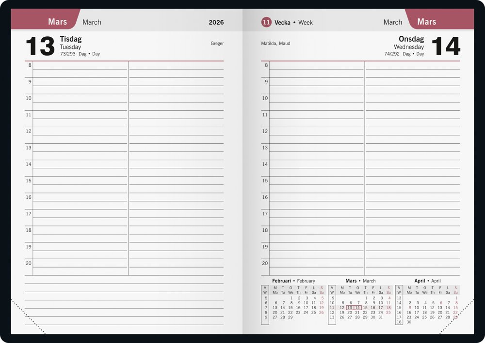 Inbunden kalender i smidigt format med en dag per sida, timindelad mellan klockan 8 och 20. Innehåller kalendariska uppgifter, tre månadsöversikter på varje uppslag, veckoöversikt samt årsplaner för innevarande och nästa år. Pärm i svart konstläder.