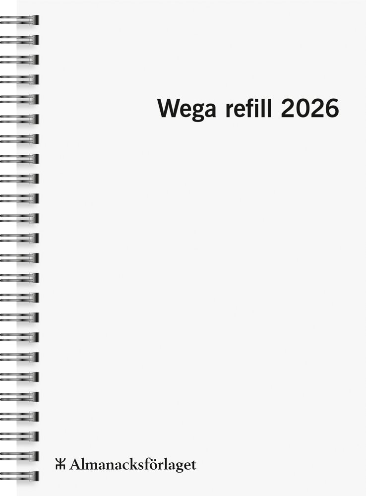Wega · Refill · 15 x 21 cm · 128 sidor · Kartong · Wire-O · 1 vecka/uppslag · Årsplaner 2026/2027 · Utbytbart kalendarium, Kalendariska uppgifter, Allmänna helgdagar, Nationella helgdagar, Årsschema, Namnsdagsförteckning, Solens upp- och nedgång, Anteckningssidor