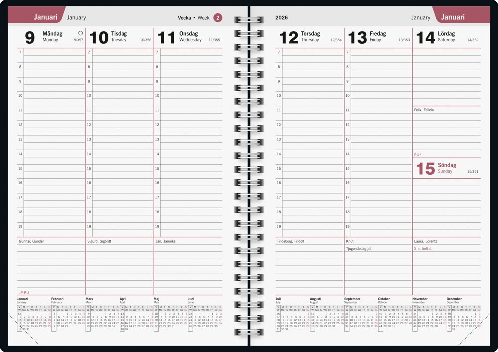 Refillkalender för modell Wega med en vecka samt hela årets månadsöversikter på varje uppslag. Innehåller årsplaner för innevarande och kommande år, nationella helgdagar, namnsdagsförteckning, solens upp- och nedgång samt anteckningssidor.