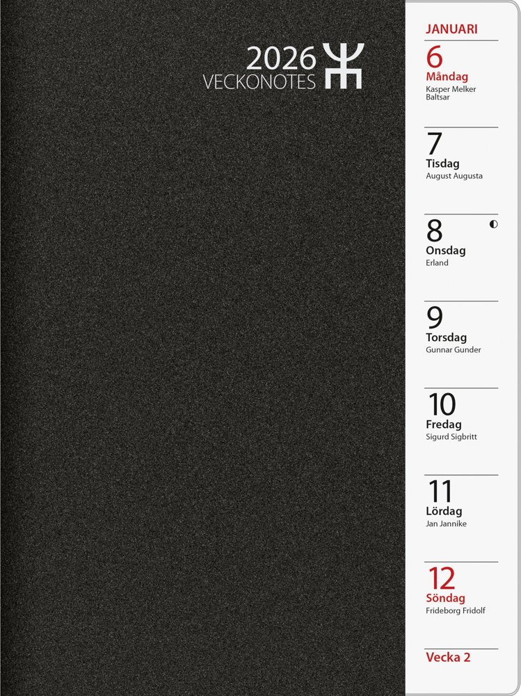 Veckonotes · 15 x 21 cm · 128 sidor · Plast · Svart · Wire-O · 1 vecka/uppslag · Utbytbart kalendarium, Rutad anteckningssida på varje uppslag med fyra månaders månadsöversikt, Årsschema, Namnsdagsförteckning, Anteckningssidor