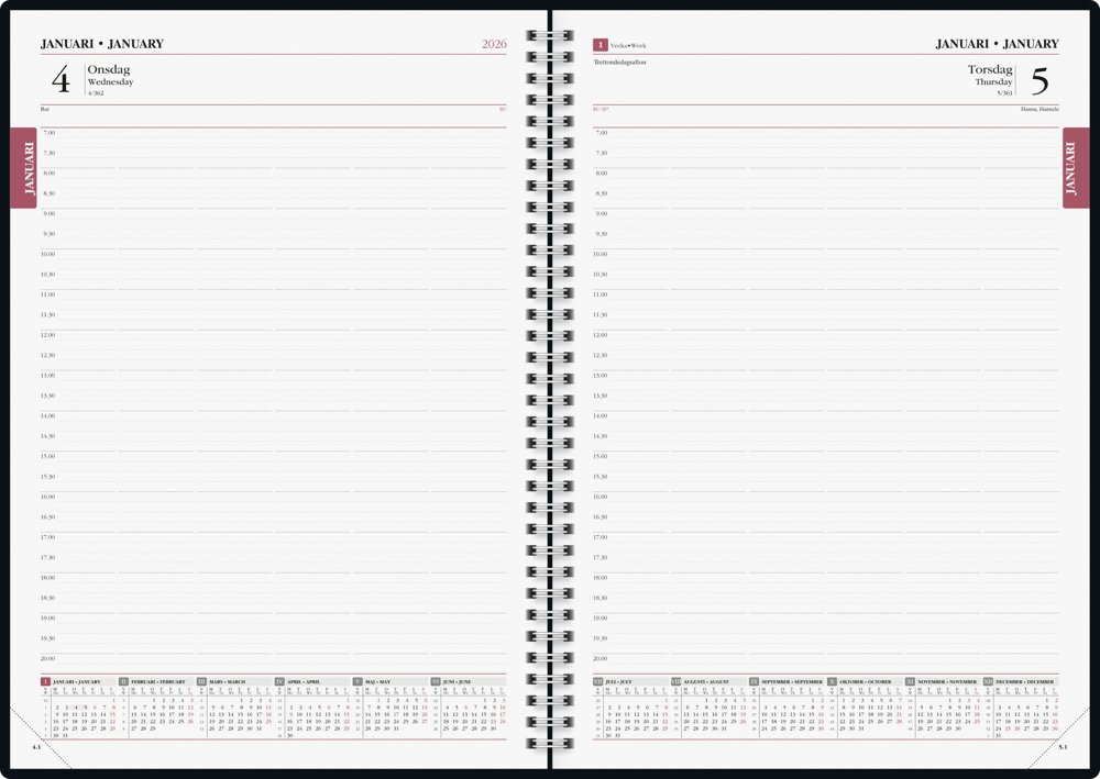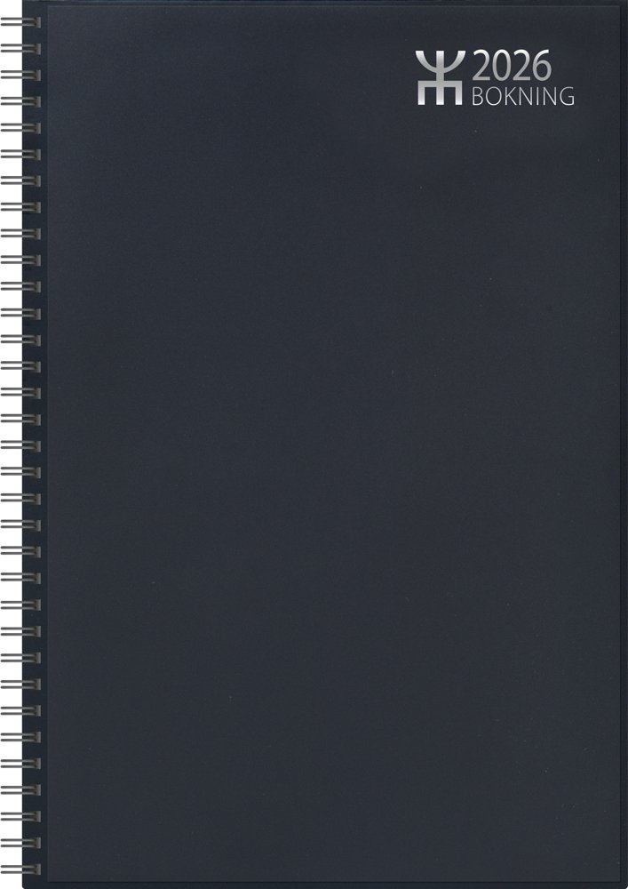 Bokning · 21 x 30 cm · 372 sidor · Plast · Svart · Wire-O · 1 dag/sida · Kvartsindelad · Årsplan 2026 · Nationella helgdagar, Sex månaders månadsöversikt på varje uppslag