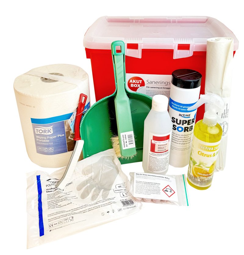 Snabb och enkel lösning när kroppsvätskor (t.ex. blod, spyor, urin) kommit på fel plats. Passar även till alla andra flytande vätskor. Perfekt för t.ex. daghem, skolor, äldreboende, bussar.