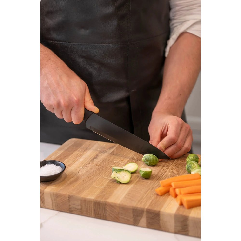 Knivsetet är tillverkat av elegant svartlackerat rostfritt stål, vilket ger både hållbarhet och ett elegant utseende. Setet innehåller fem olika knivar för att täcka ett brett utbud av köksuppgifter: en 19,5 cm grönsakskniv, en 23 cm universalkniv, en 33,5 cm täljkniv, en 32 cm brödkniv och en 32 cm kockkniv. Varje kniv är utformad för att ge precision och användarvänlighet, vilket gör dem idealiska för både vardagsmatlagning och speciella tillfällen.