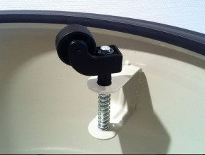 Den är försedd med hjul som fälls upp automatiskt när du ställer dig på den. Står väldigt stadigt när hjulen är uppe, samtidigt som den är lätt att sparka med sig.