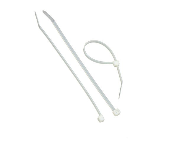 Av amidplast. Avsedd för buntning av kablar m.m samt förslutning av påsar och mindre säckar.