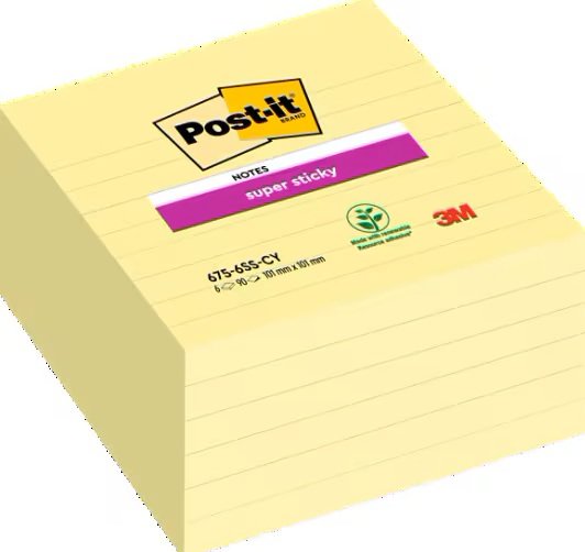 Post-it® Super Sticky Large Notes är starkare och sitter kvar längre. De har dubbelt så stark häftförmåga som Post-it® Original Notes, så att du kan vara säker på att ditt meddelande når fram. De klassiska Canary Yellow självhäftande Post-it® Notes är perfekta för lodräta ytor och material som är svåra att fästa på, är linjerade, perfekt för flera anteckningar eller långa meddelanden och påminnelser. De är superstarka och superflexibla, och designade för att dina meddelanden ska synas. Tillverkade av PEFC-certifierat papper från certifierade, förnybara och hållbart förvaltade skogar med ett häftämne av ett förnyelsebart material som till 60 % kommer från en växt som växer upp igen varje år.