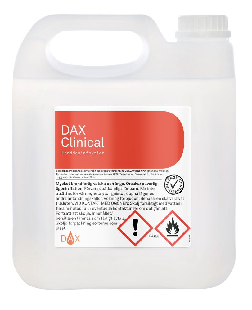 DAX Clinical Handdesinfektion är en hygienisk, flytande handdesinfektion som är utprovad i samarbete med svensk sjukvård. Produkten är effektiv mot bakterier, jästsvamp, mykobakterier och många typer av virus som t.ex. adenovirus, och murine norovirus. Produkten är etanolbaserad och har en alkoholhalt på 75 vol%.