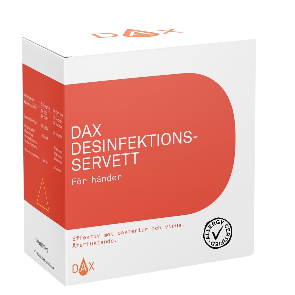 DAX Desinfektionsservett för händer är en singelförpackad servett som är lätt att ha med sig. Servetten är indränkt med ca 75 vol% denaturerad etanol och är effektiv mot bakterier, jästsvamp och många olika virus inkl. Coronavirus.