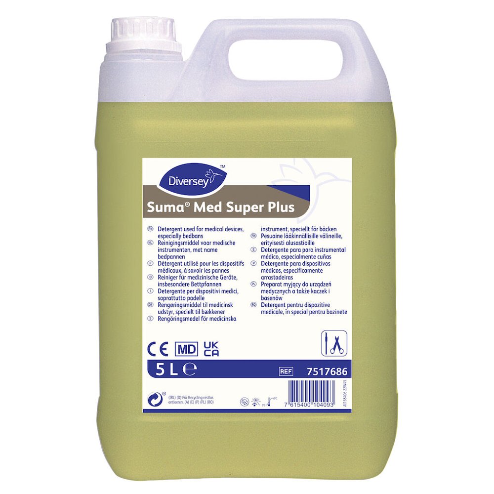 Suma Med Super Plus är ett lågalkaliskt maskindiskmedel anpassat för disk- och spoldesinfektorer. Produkten är speciellt formulerad för instrumentdisk, rondskålar, anestesiutrustning och bidéskålar. Kan även användas till kärlkokare och maskindisk. Produkten passar i mjuka och medelhårda vatten.