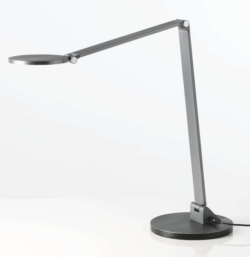Symmetrisk skrivbordslampa. 2-ledad med runt, slimmat lamphuvud och bordsfot.