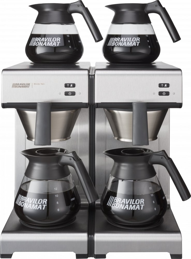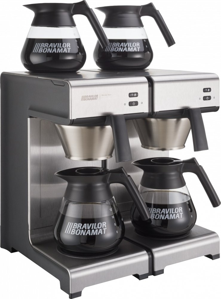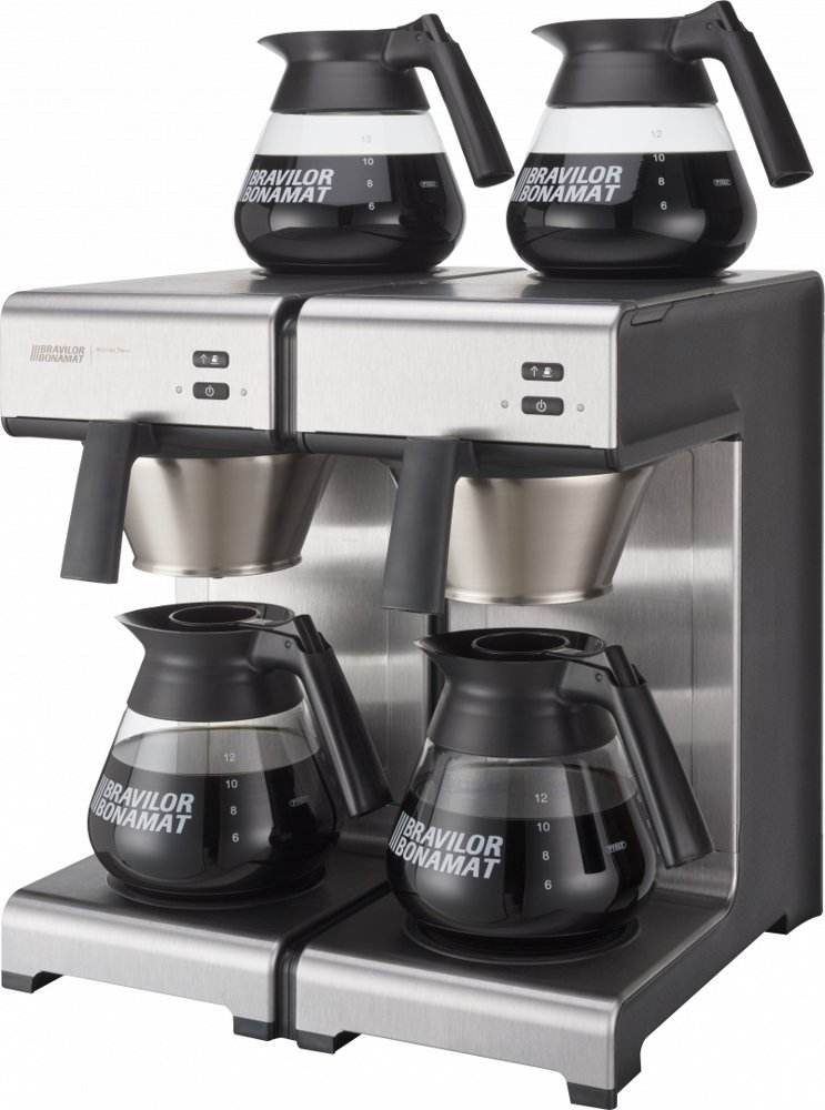 Filterbryggare utan anslutning till vatten. Levereras med 4 kannor och 2 rostfria filterhållare. Modell med 2 bryggcentraler och 4 värmeplattor.