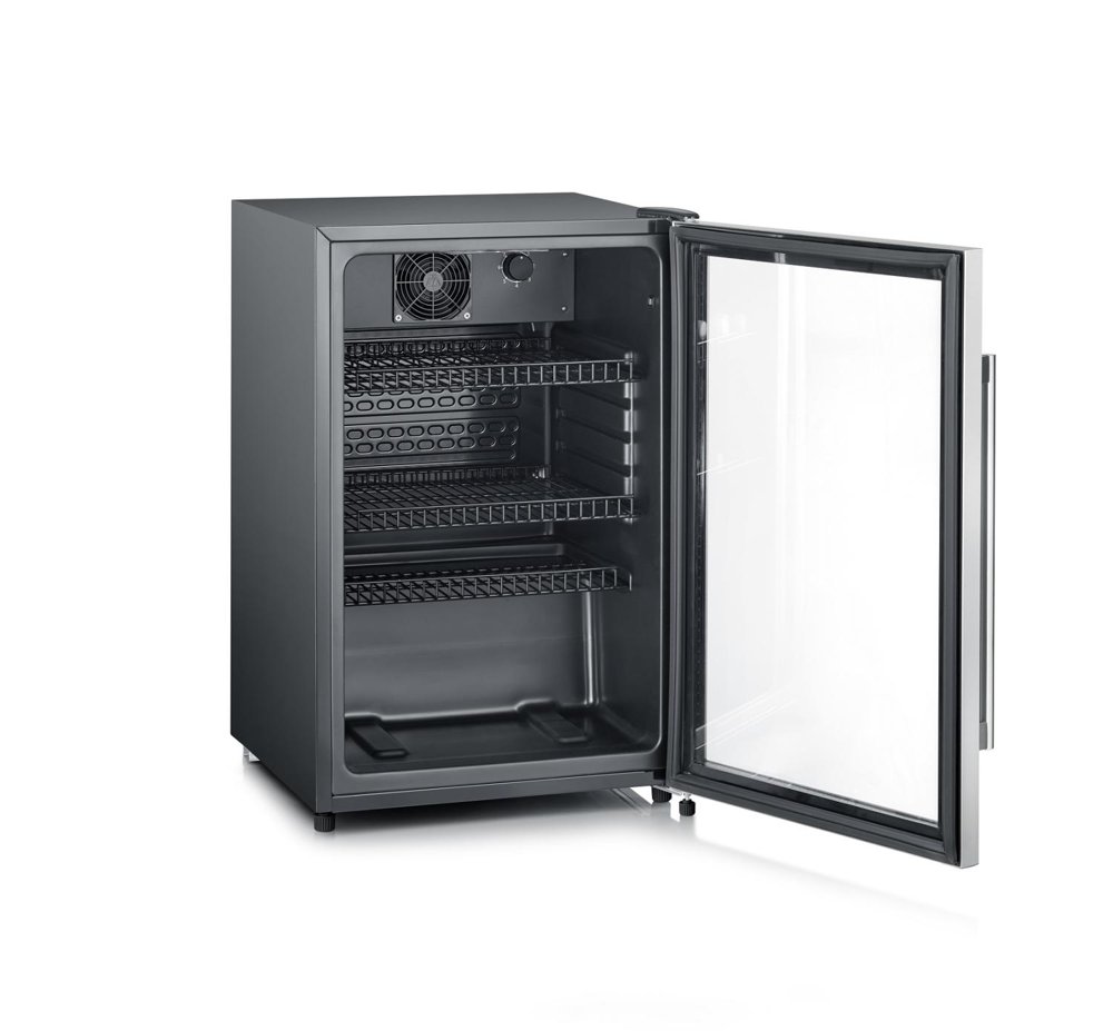 Svart kylskåp med glasdörr och gallerhyllor med utrymme för upp till 56 flaskor (33cl) eller 42 flaskor (50 cl).