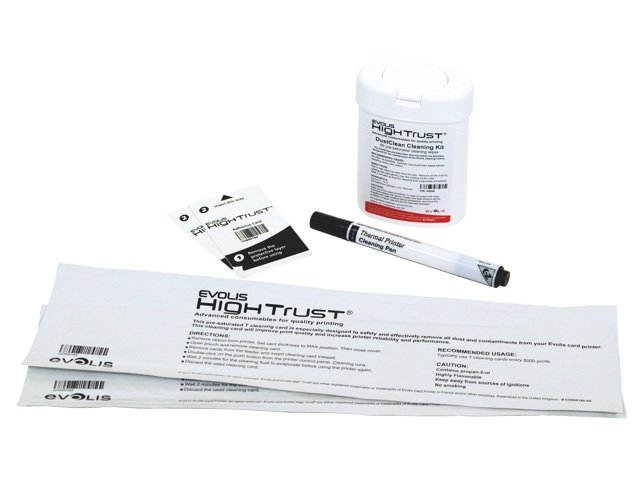 Cleaning kit for a complete cleaning of the printer. Includes 2 pre-saturated ''T'' cards, 2 adhesive cards, 1 pen, 1 dispenser of 60 pre-saturated lint-free wipes