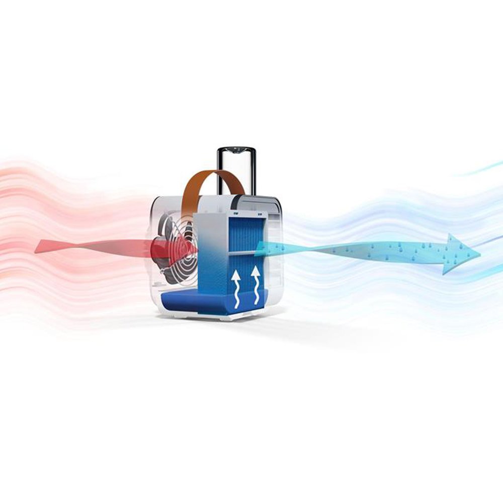 Med det praktiska bärhandtaget är bordsfläkten alltid redo.Luftkylning och luftuktning med en fläkt och avdunstningsprincipen.