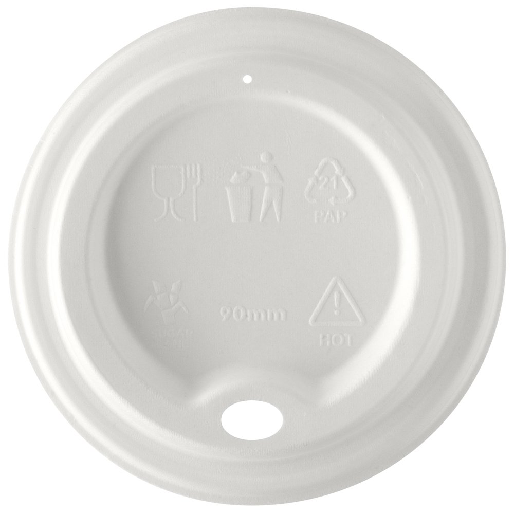 Lock för Vegwares varma bägare i 89-serien. Ett lock för varmt kaffe eller te att ta med. Tillverkad av återvunnen växtfiber. Benvit färg, präglad med Vegware-budskap. Prisbelönt kvalitet från Vegware, tillverkad av växter. Utformad för industriell kompostering, tillverkad av återvinningsbara material.