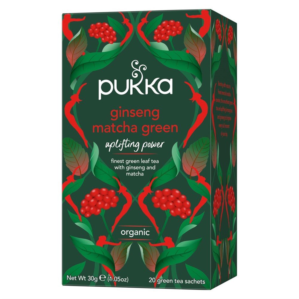 Pukka ginseng matcha green är ett grönt te med matchpulver samt kombineras med citrongräs, ingefärarot, röd ginseng och tulsi.