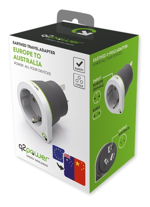 Q2power jordad reseadapter, EU till Australien/Kina, 10A, vit.