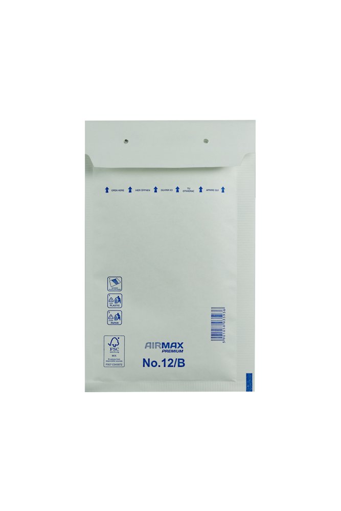 Bubbelkuvert Airmax Premium av 75g papper fodrat med 45g bubbelplast som absorberar stötar och hindrar fukt från att tränga in. Med den smarta re-open lösningen kan kuverten stängas på plastremsan om man vill att den lätt ska kunna öppnas igen. Stängs den istället på pappret så häftar förslutningen, så kuvertet kan inte öppnas utan att det lämnar tydliga spår. Produkten är FSC MIX certifierad.