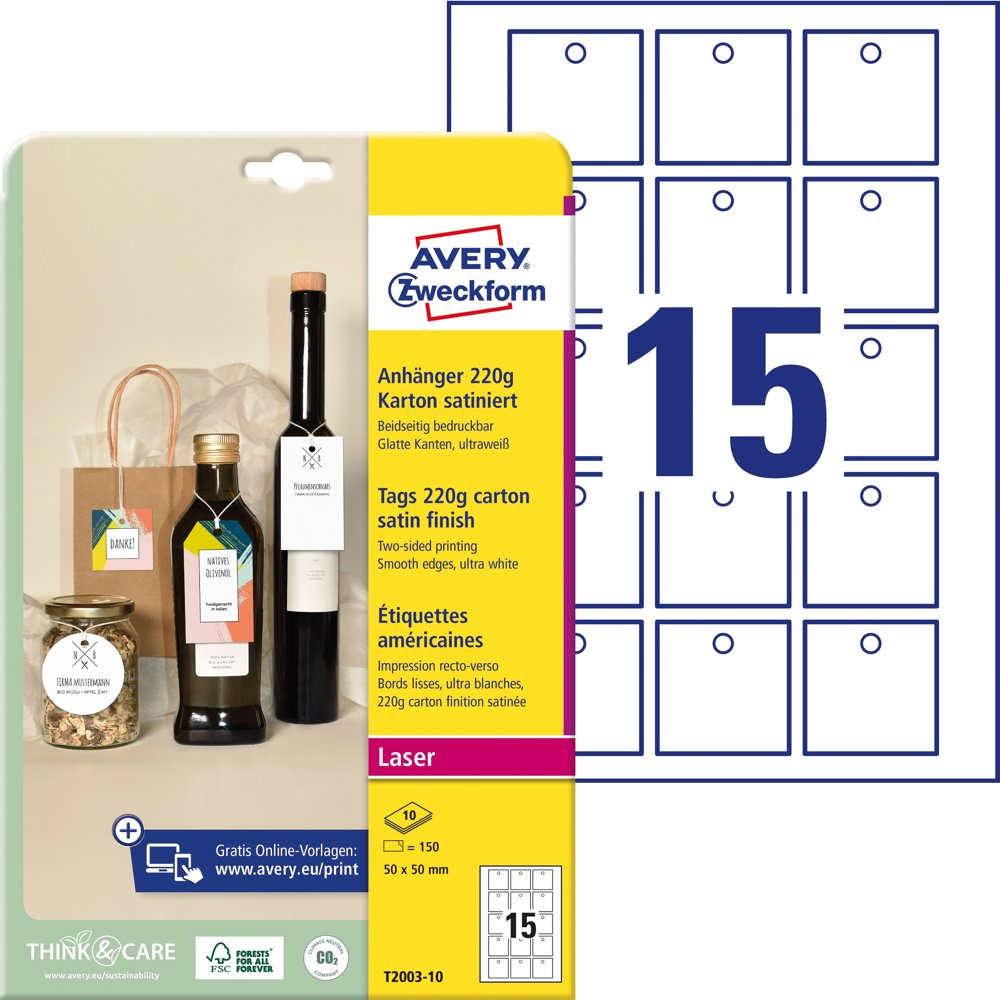 Högkvalitativa etiketter tillverkade av ultravit, satinerad och stabil kartong med en behaglig yta kan skrivas ut på båda sidor – perfekt för extra information på baksidan. Hanteringen är praktisk och effektiv: Efter att A4-arket har skrivits ut kan de enskilda taggarna separeras från arket utan problem och med helt släta kanter – tack vare Averys patenterade Quick&Clean-teknik. Etiketterna kan skrivas ut exakt på alla standardlaserskrivare, den satinerade ytan garanterar förstklassig utskriftskvalitet. För en ”hemmagjord” look kan du naturligtvis skriva på etiketterna för hand. Inkl. snören att knyta fast etiketten med.