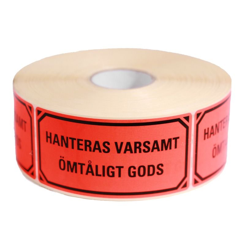 Flourescerande självhäftande etikett med svart tryck: "Hanteras varsamt" Format 100x50mm, 1000 etiketter per rulle.