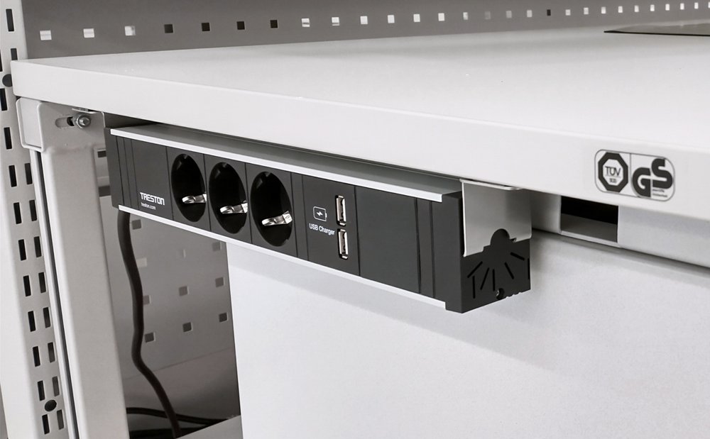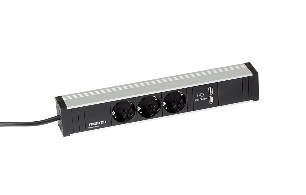 Energiskena med 3 Schuko-uttag och 2xUSB-laddare. 4,5 m lång strömsladd. Kan monteras vertikalt på pelare, på perforerade plåtar, över eller under bordsskivan.