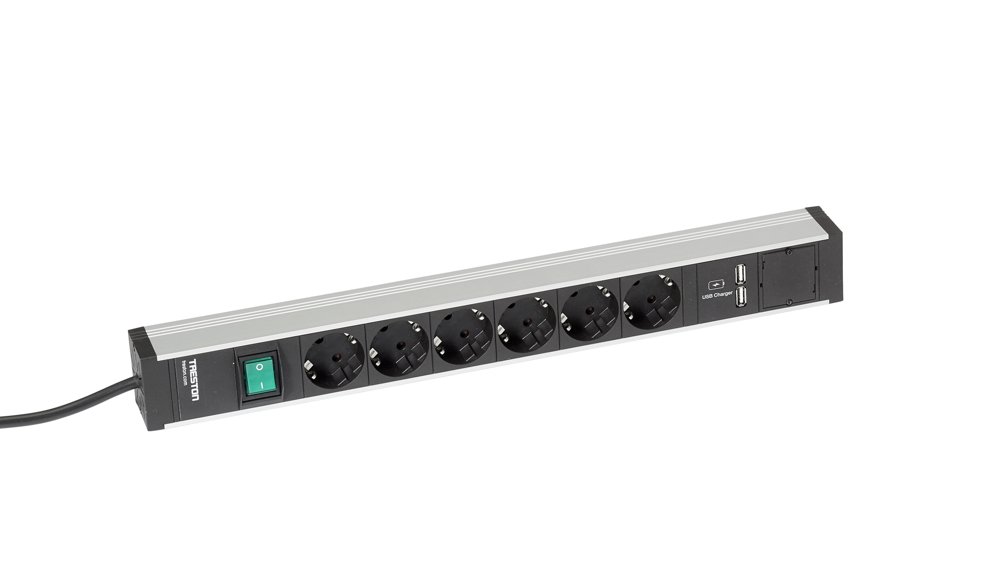 Energiskena med 6 Schuko-uttag, strömbrytare och 2xUSB-laddare. 4,5 m lång strömsladd. Kan monteras vertikalt på pelare, på perforerade plåtar, över eller under bordsskivan.